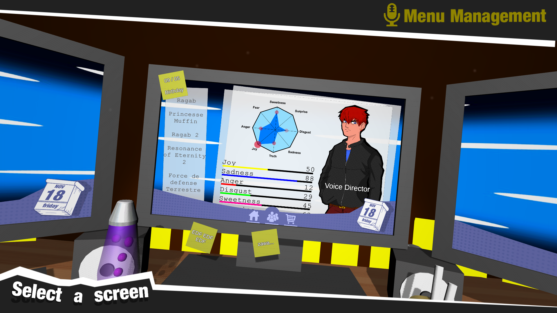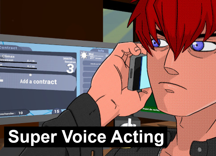 Super voice Acting is a RPG-Management Game.In the RPG part, you play as a voice acting art director during a voice recording session and play them as a turned based RPG where attacks are replaced by emotions. In the management part, you will accept contracts, manage your actors and your budget, following a calendar.