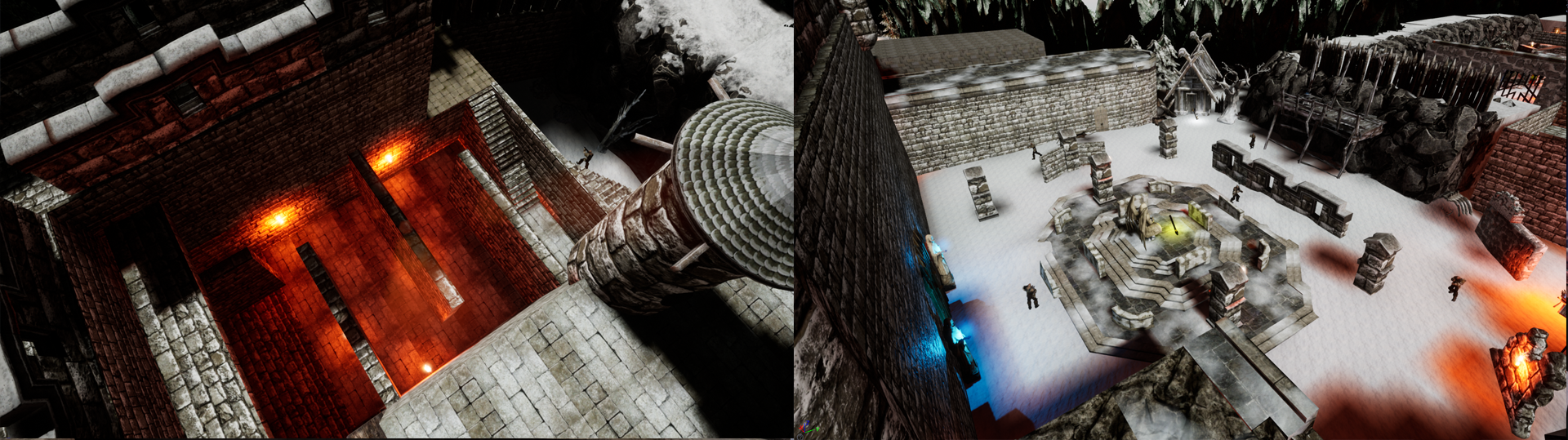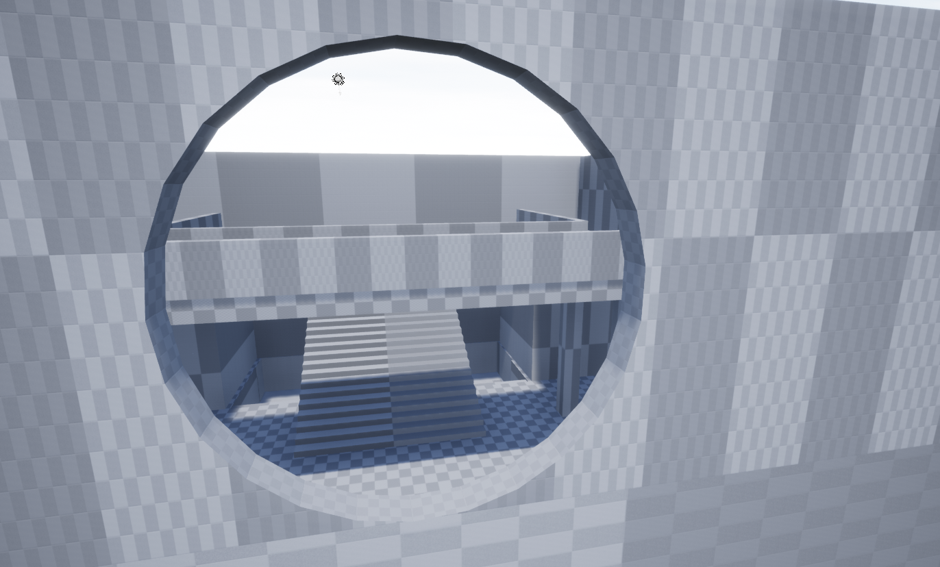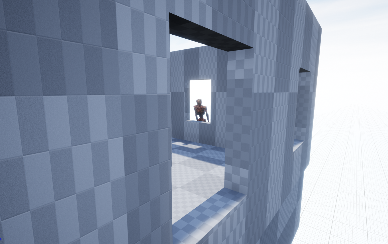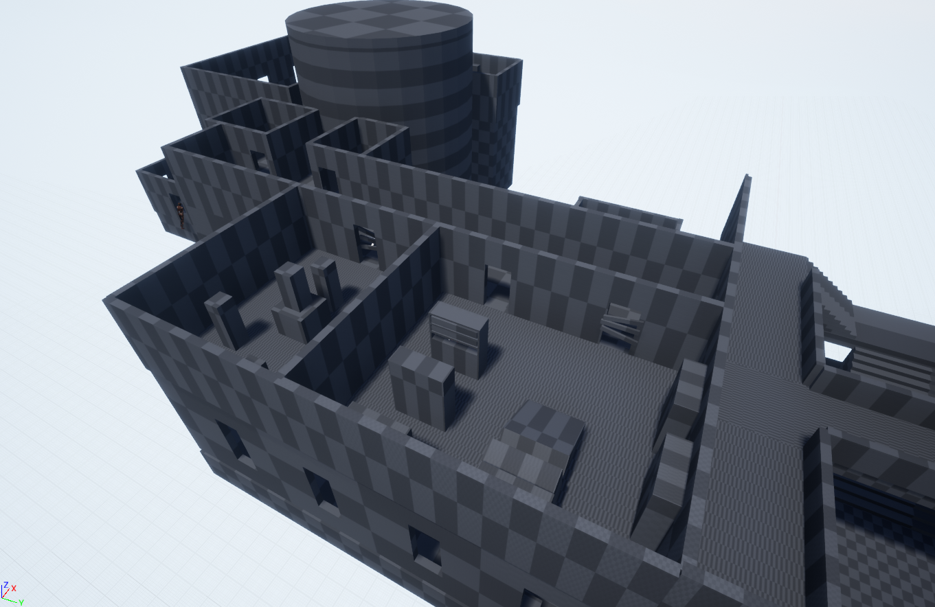 In that sadly untitled project, I have chosen to allow the player to have a top view camera when they were motionless. However, when the player moves around they need to go in first person view mode. With that mechanic in mind I have created a level where the top view was as important as possible but where sometimes roof tops could provide the player to clearly see what was surrounding them.