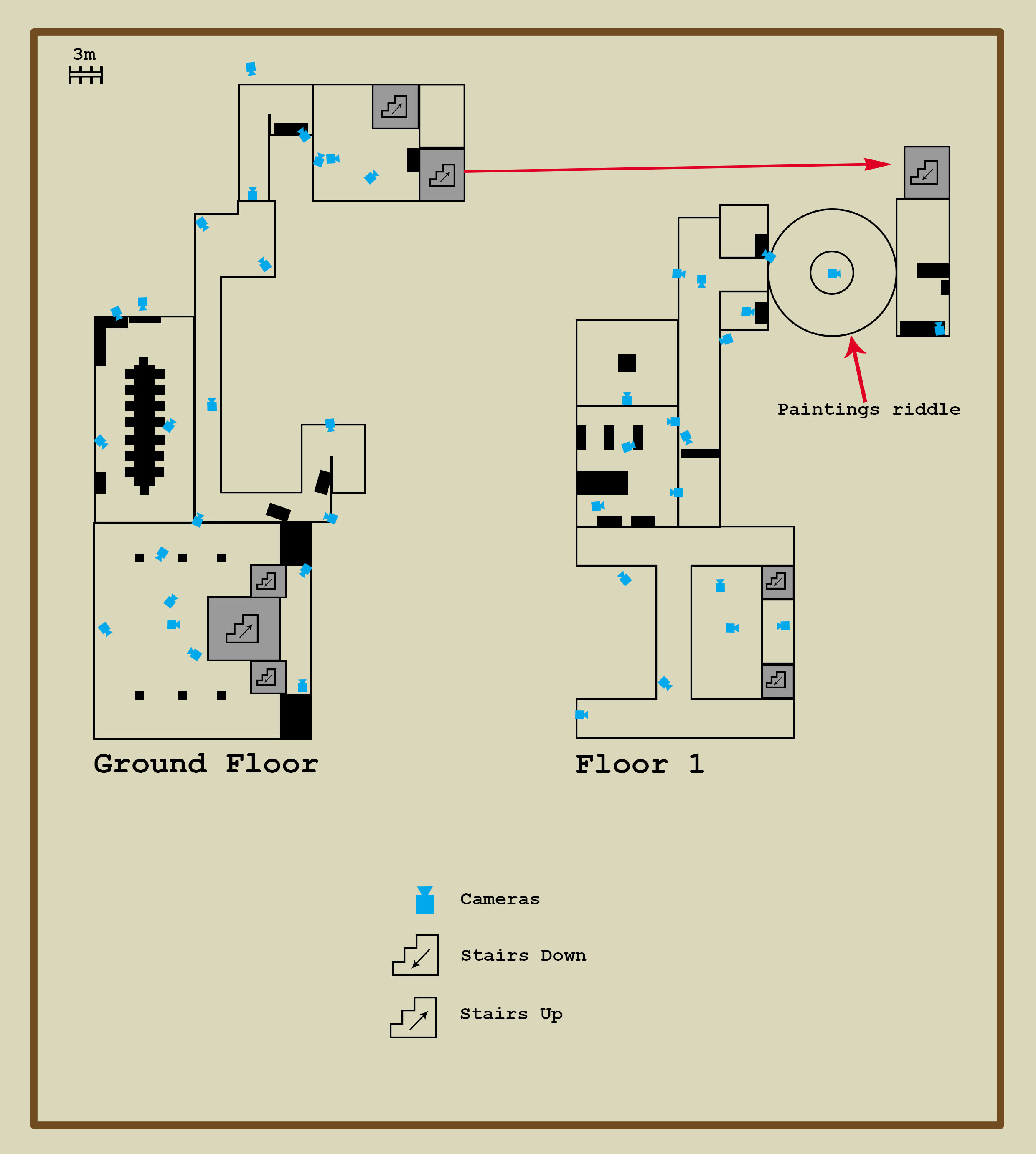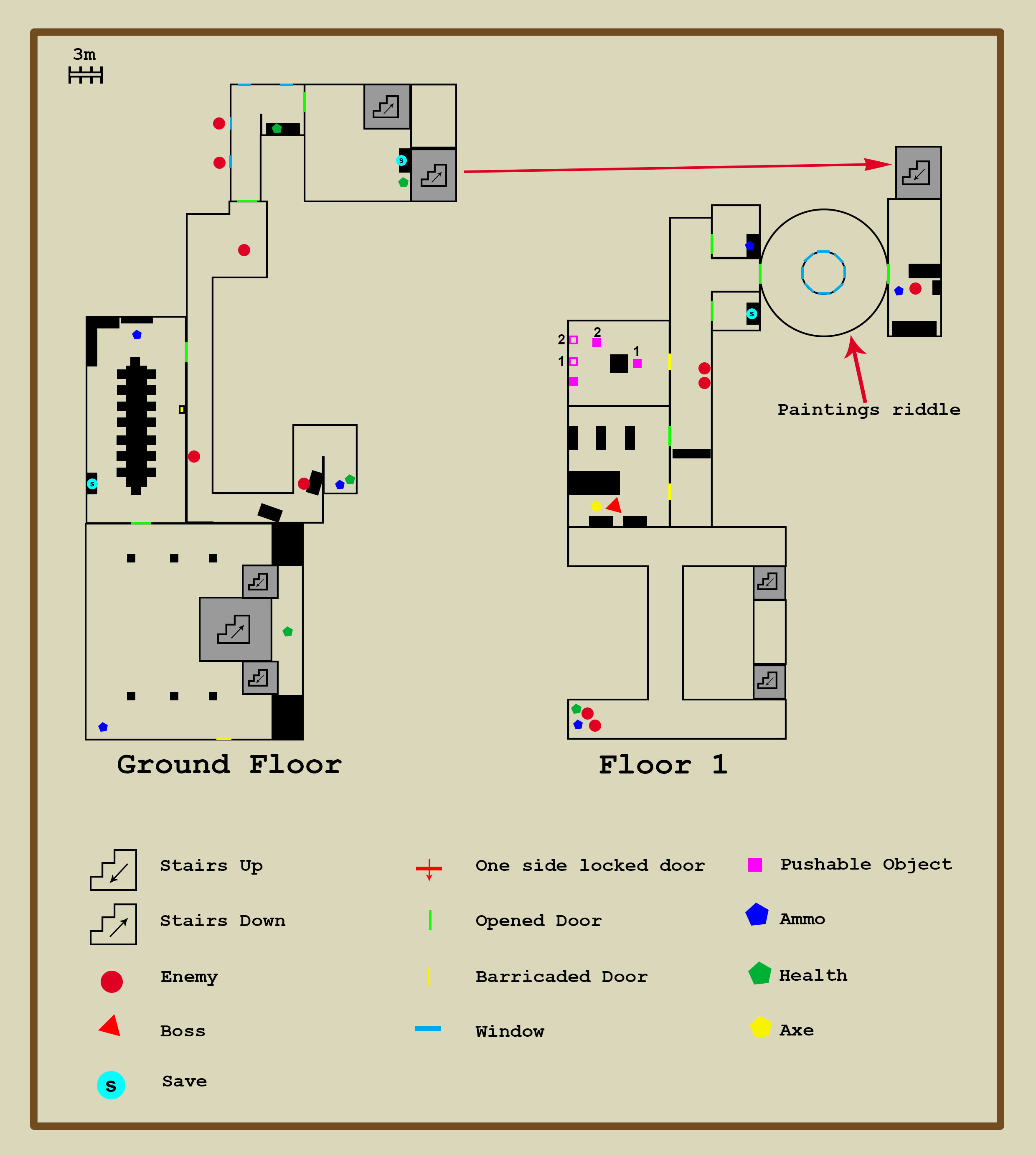 In the level, the player will also find some riddles, the first one in the circular room, where they will need to move paintings to open the clock in the dinner room. Another riddle can be found once the player has found the axe. They will need to move some statues at certain places: this will unlock the shotgun.